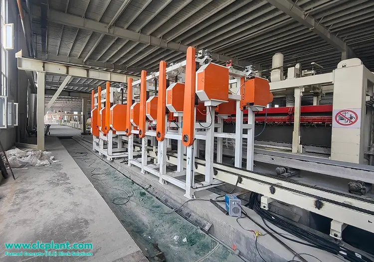 本项目为一条高度定制化的轻质砌块生产线,集成自动化脱模机、高速双道龙门切割锯、高精度发泡机、叠加码垛机、去皮机等核心设备,实现从原料处理到码垛的全流程自动化操作,日产能力达400立方米。